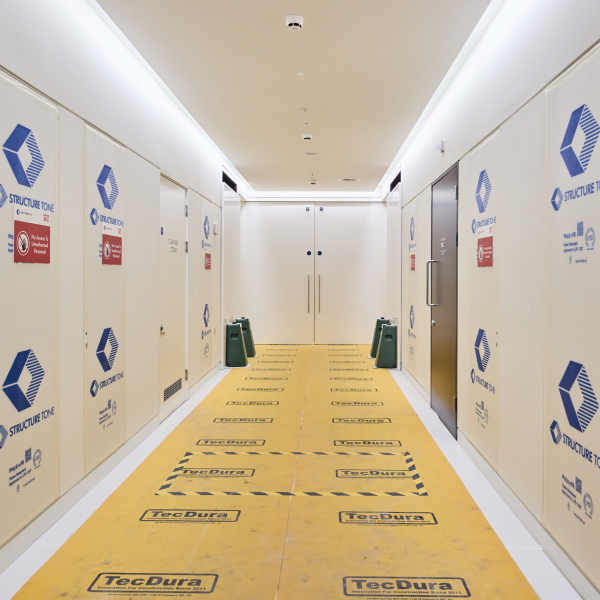 The project involved the full protection and site setup works across Levels 3 and 4 for our client, Structure Tone. The scope included installing Corex, foam, MDF, and Tecdura protection to key areas such as WC facilities, riser doors, columns, stair cores, lift lobbies, and façades. Additional works included the installation of Plasloc partitions to create office and welfare areas, carpet and vinyl flooring, and a tea point setup on Level 4. Temporary electrics and lighting were also provided across both levels, along with a key clamp system for future slab cut-outs.